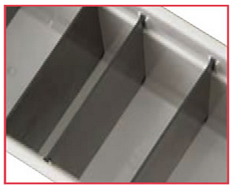 This unique bin design has the option to accept 8 dividers allowing multiple configurations. 24" deep bin. Each divider section is positioned in various lengths within the bin to allow multiple configurations to fit most applications. Special designed dividers fit securely within the VantageBin to prevent bowing and product merging within the container.