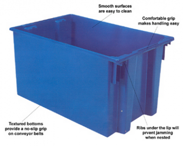 Ribs under the lip prevent jamming when nested. Textured bottoms provide a no-slip grip on conveyor belts. Smooth surfaces are easy to clean. Comfortable grip makes handling easy.