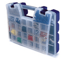 The unique design won’t allow parts and equipment to gravitate to other compartments when lids are shut. Separate lid compartment holds small items. The main compartment holds larger items. Organizers are blue with clear lids and black latches.