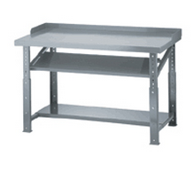 The adjustable height workbenches features telescoping C-channel legs that provide a range of work heights from 30" to 40". This makes it perfect for both standing and sitting applications. Workbenches are available with 30" x 60" or 30" x 72" work surfaces. Powder-coated steel work surface extends 1 1/2" and hardwood surface extends 2" on the front and sides to accommodate a vise or clamp.